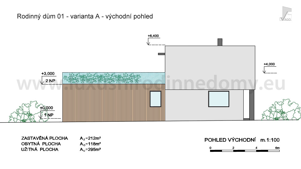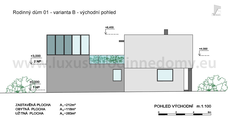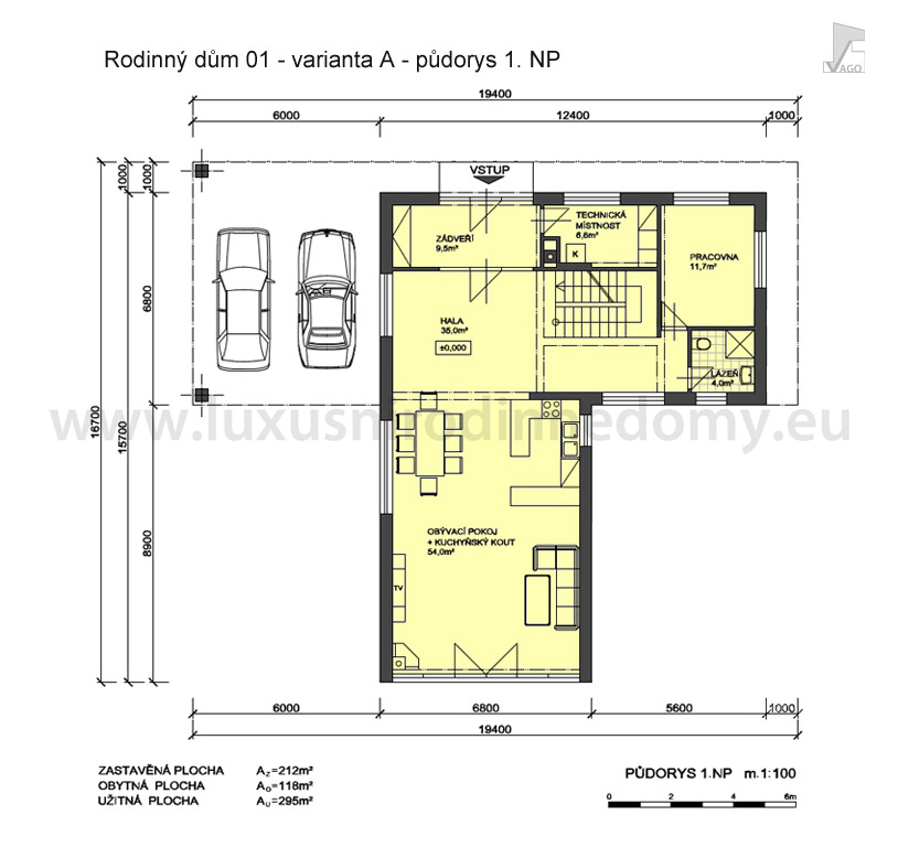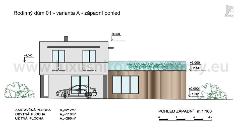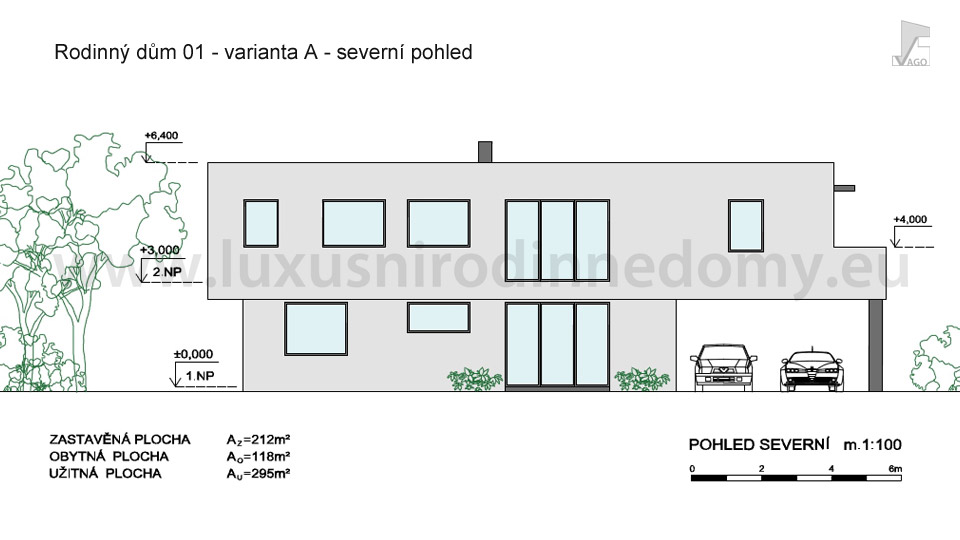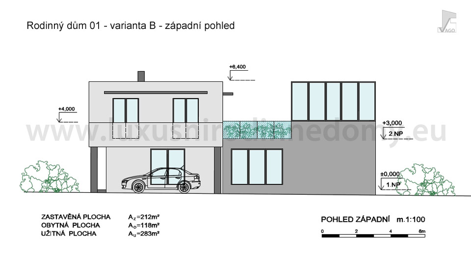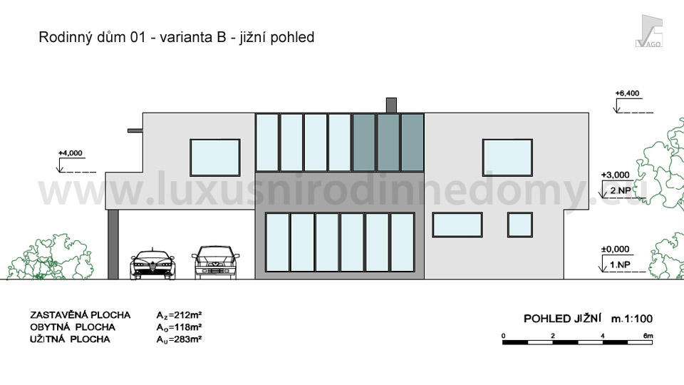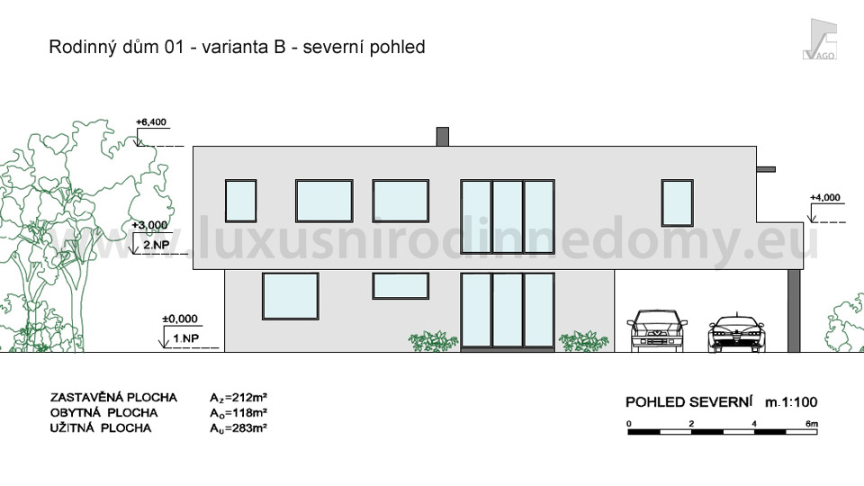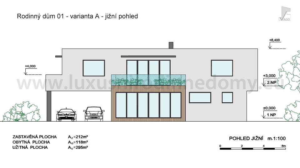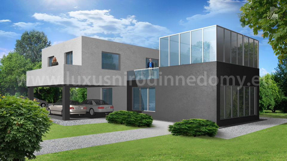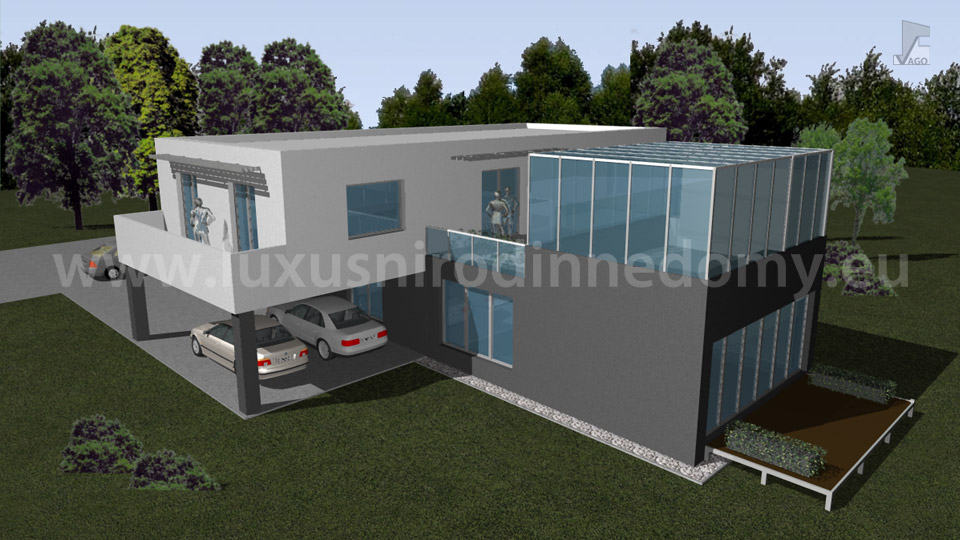 - Kryté garážové stání křídlem domu pro 2 vozy. Tento prostor možno provést namísto stání jako obytný, nebo zde umístit bazén