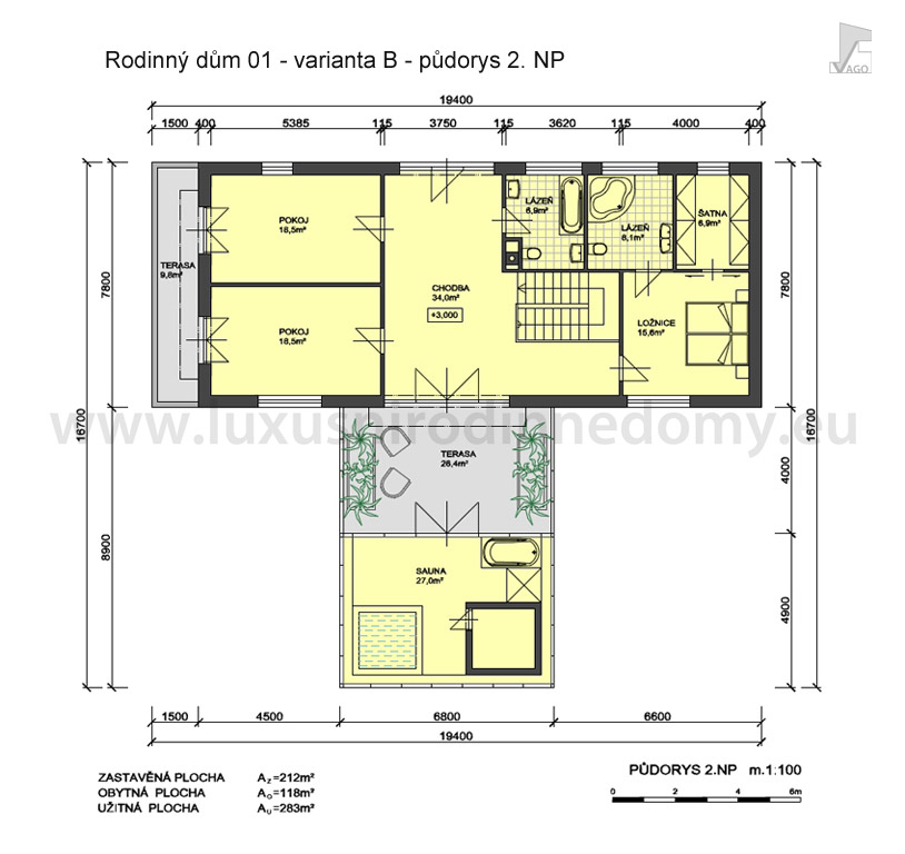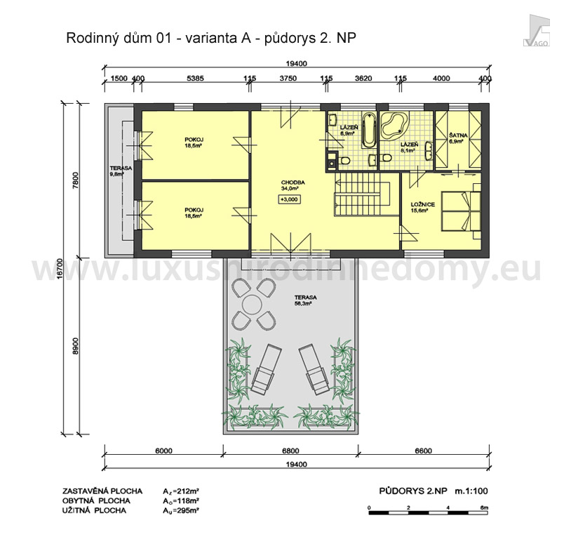 - V 2. NP pokoje, ložnice, terasa - ve var. A otevřená,
