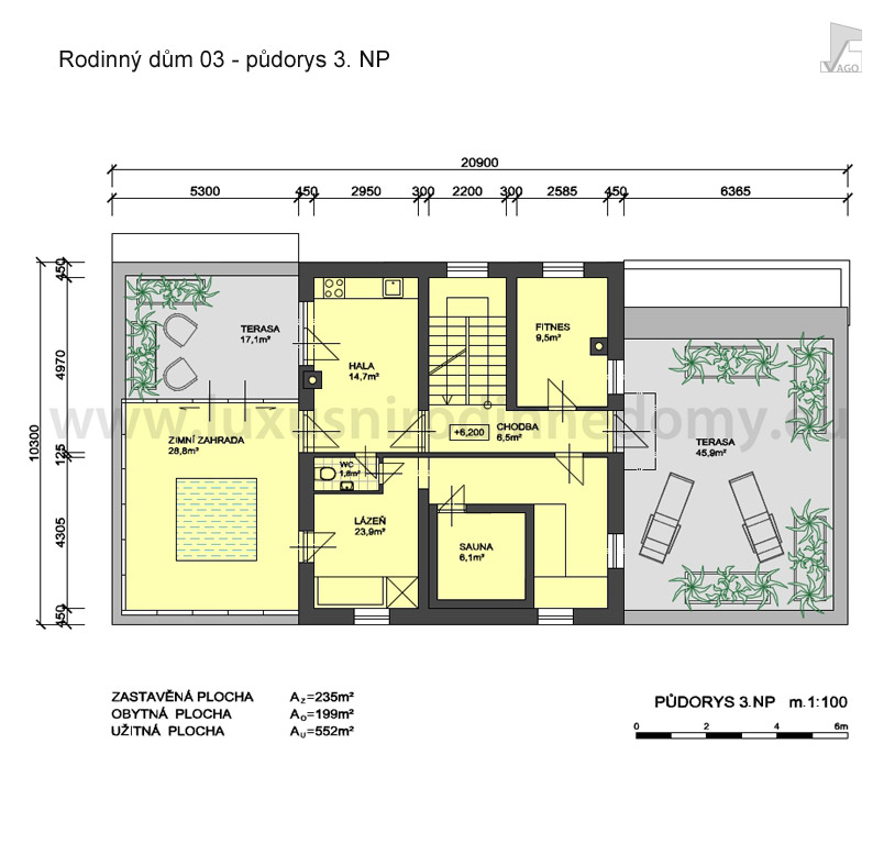 - V ustupujícím 3. NP sauna se zázemím, fitness, zimní zahrada s bazénem, 2 samostatné terasy.