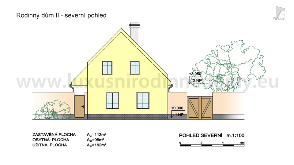 - Parkování mimo disposici domu. Sedlová střecha sklon 45° s nadstřešní atikou.