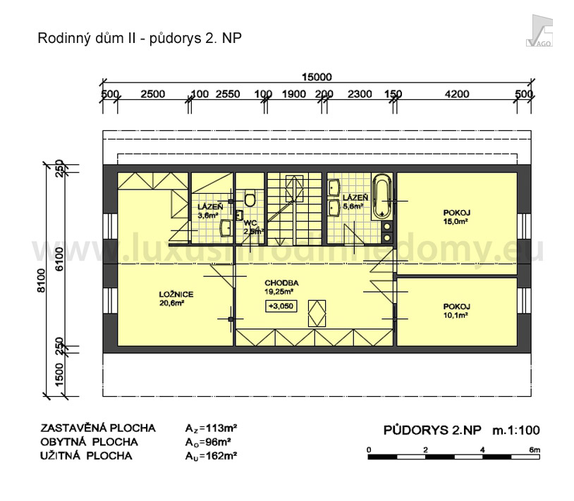 - V 2. NP pokoje, na přání vikýř v chodbě v ose domu, pohodlné 2 ramenné schodiště.